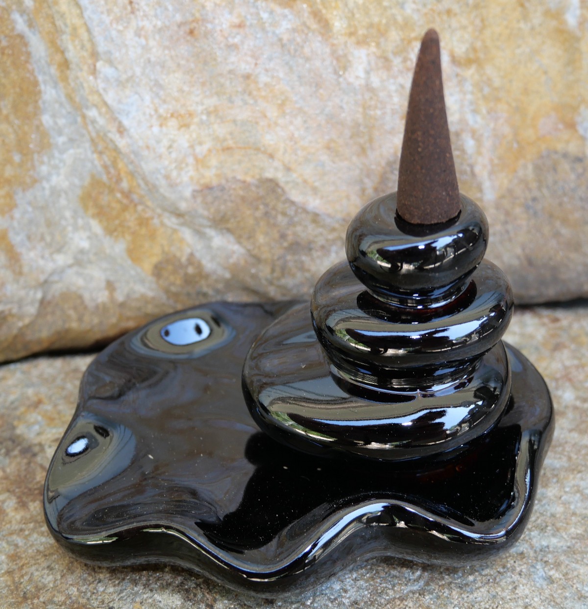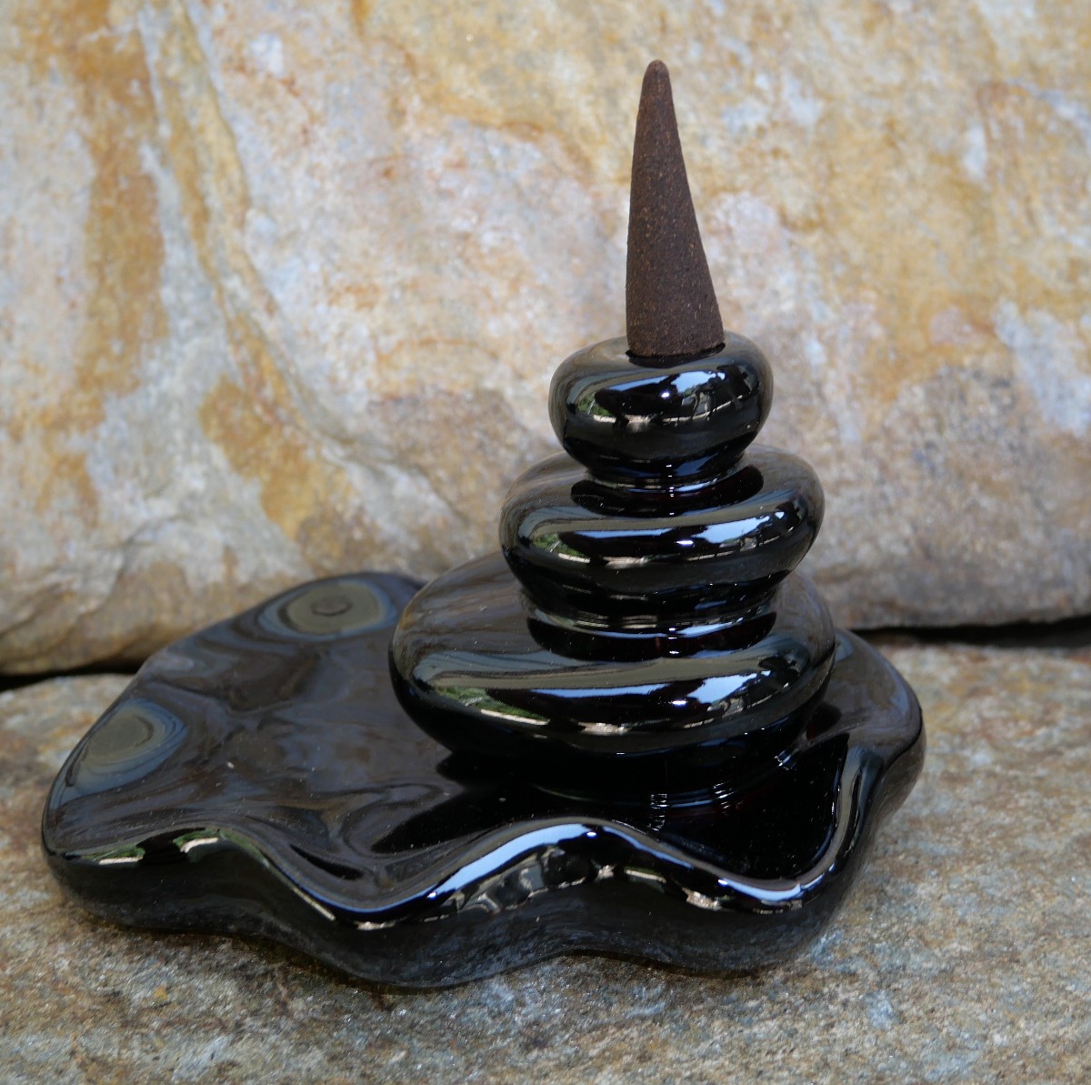 När du tänder din rökelsekon kommer den att börja ryka. Rökelsen är tyngre än luft och faller ner i vackra svängar och vridningar, genom hålet och ner över objektet, för att samlas i poolen längst ner. Det är en fantastisk syn att betrakta och ger en känsla av djup avslappning.